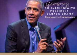 Op 1 mei staat president Barack Obama live in de Ziggo Dome in Amsterdam. Je zult president Barack Obama horen spreken over de kracht van leiderschap, een gelijkwaardige samenleving en de verantwoordelijkheid hoe om te gaan met de onvoorspelbare tijden. Het is een unieke en bijzondere gebeurtenis die je niet mag missen!